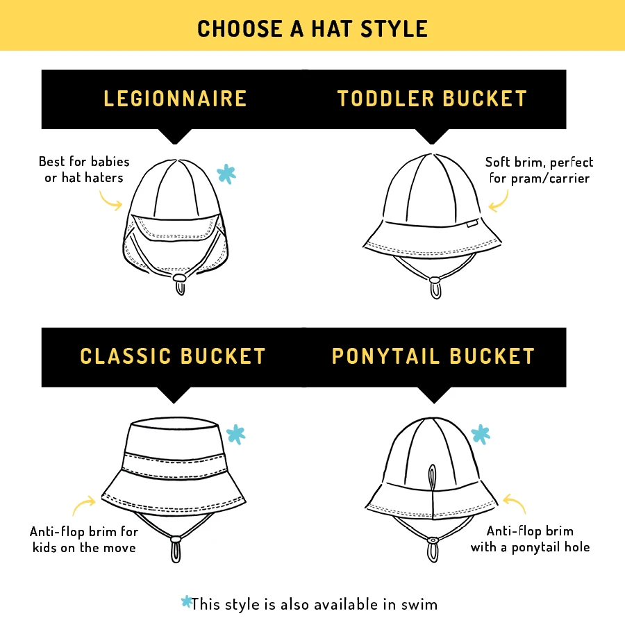 • Classic Bucket Hat - Best for 2 yrs+. Easy to wear, easy to pack, great for Kinder and weekends.