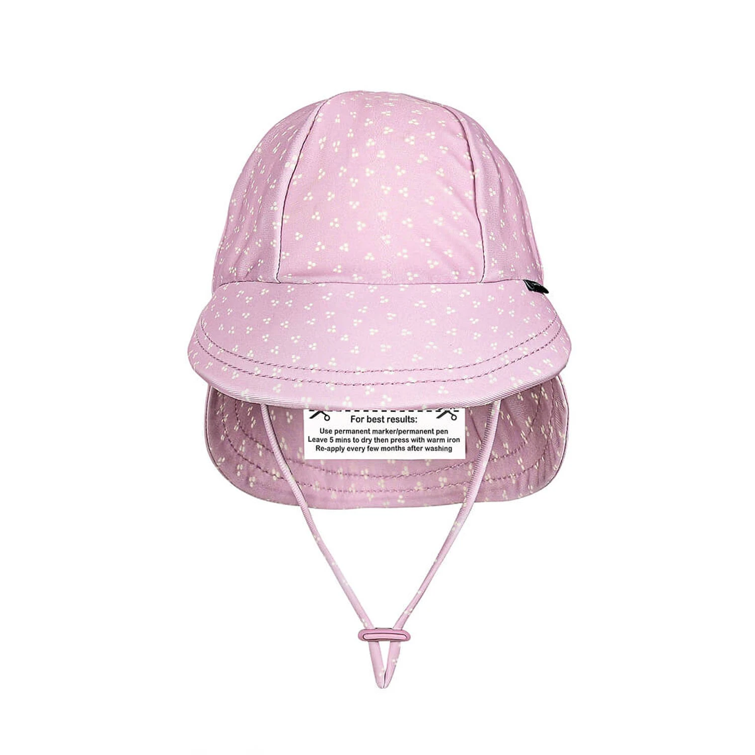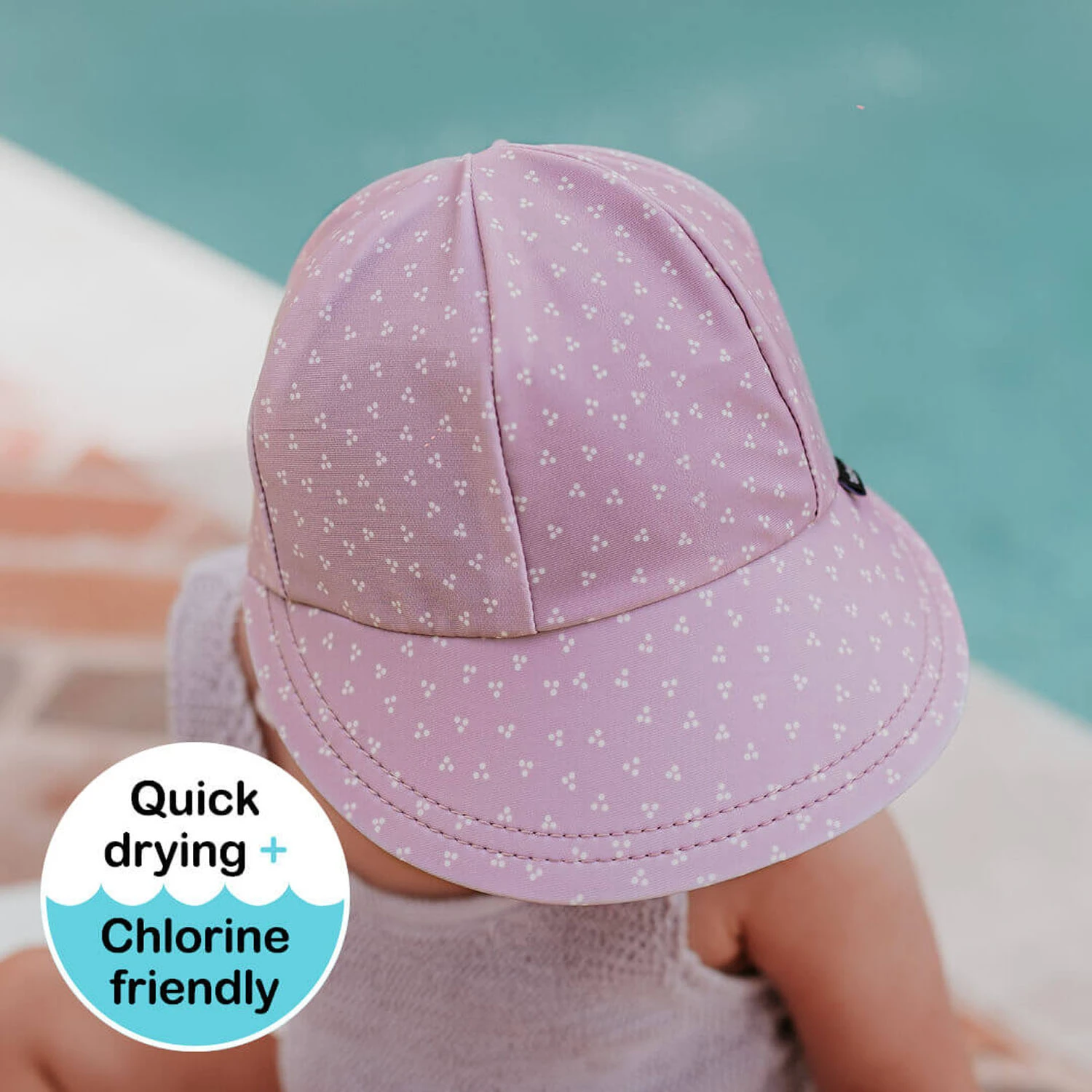 Lilac is still having a moment! We love this alternative to an all-pink hat. A smattering of cream triangular dots keeps things simple but stylish. Available in Legionnaire, Ponytail Bucket and Wet Bag.