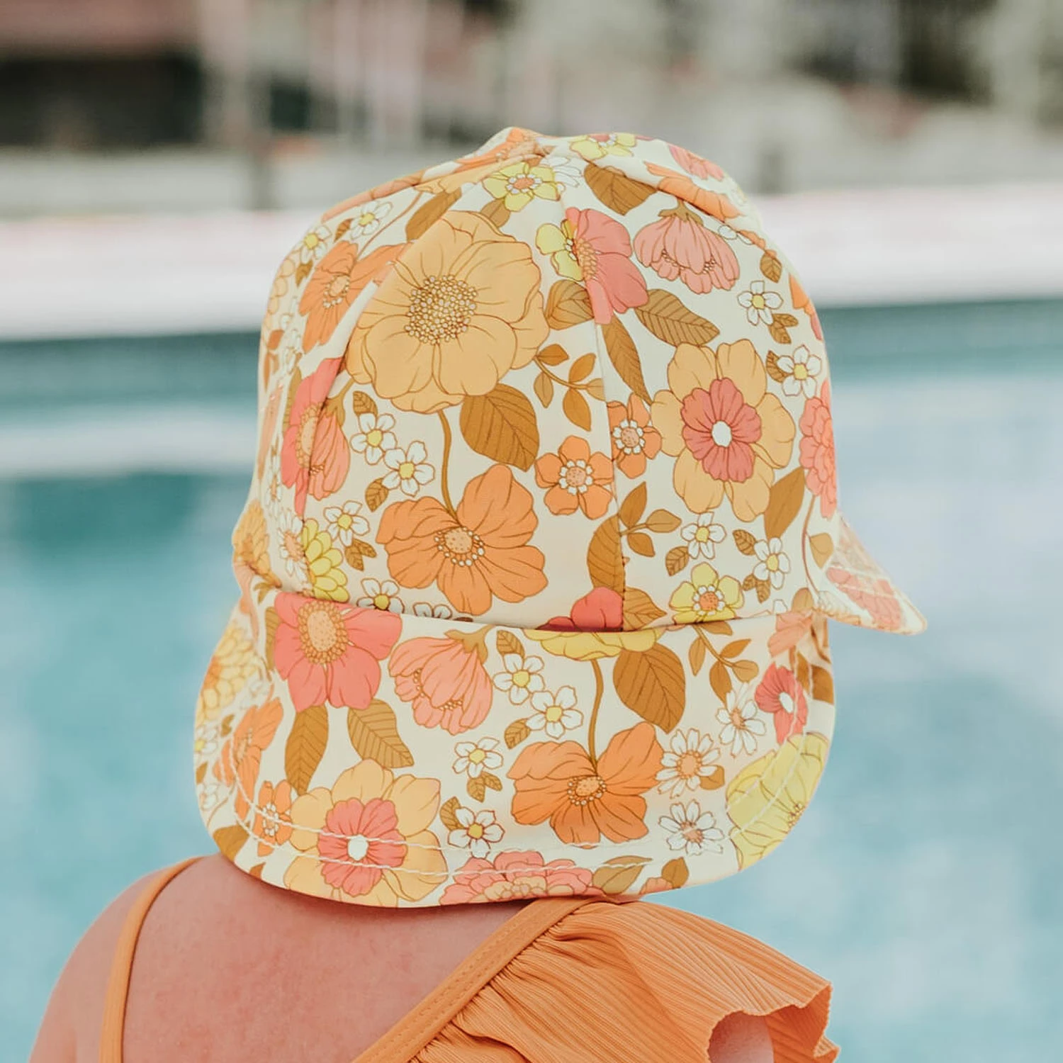 Inspired by the boho vibes of the ‘70s, Tallulah is a little hippy dippy Woodstock, a little retro beach chic, and a whole lotta cool. Guaranteed to brighten up a simple orange or yellow bikini! Pair it with our Peach rash vest for sun-safe style. Available in Legionnaire, Ponytail Bucket, Ladies Swim Visor and Wet Bag.