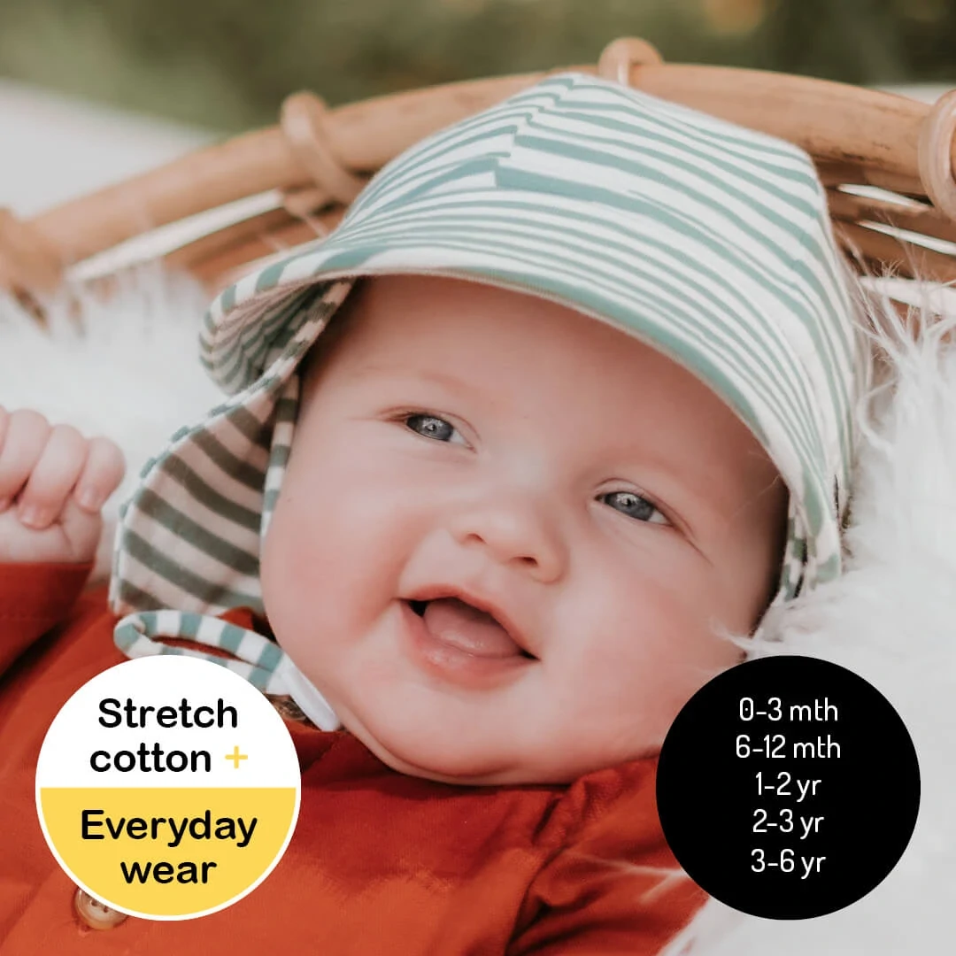 The Legionnaire hat is built for comfort - so much that kids forget they're wearing it! This makes it the best style for hat-haters and babies to wear while in prams and baby carriers. Made with super-stretchy and lightweight cotton jersey for a perfect fit keeping your little ones head cool under the hot Australian conditions & rated UPF50+ excellent protection.