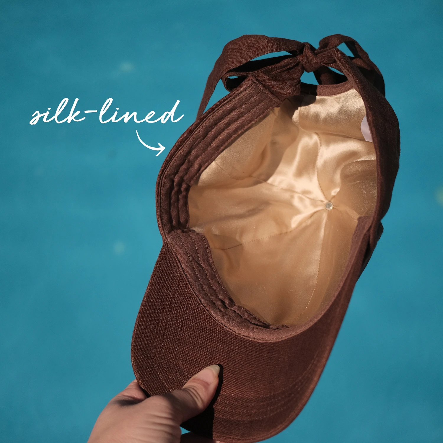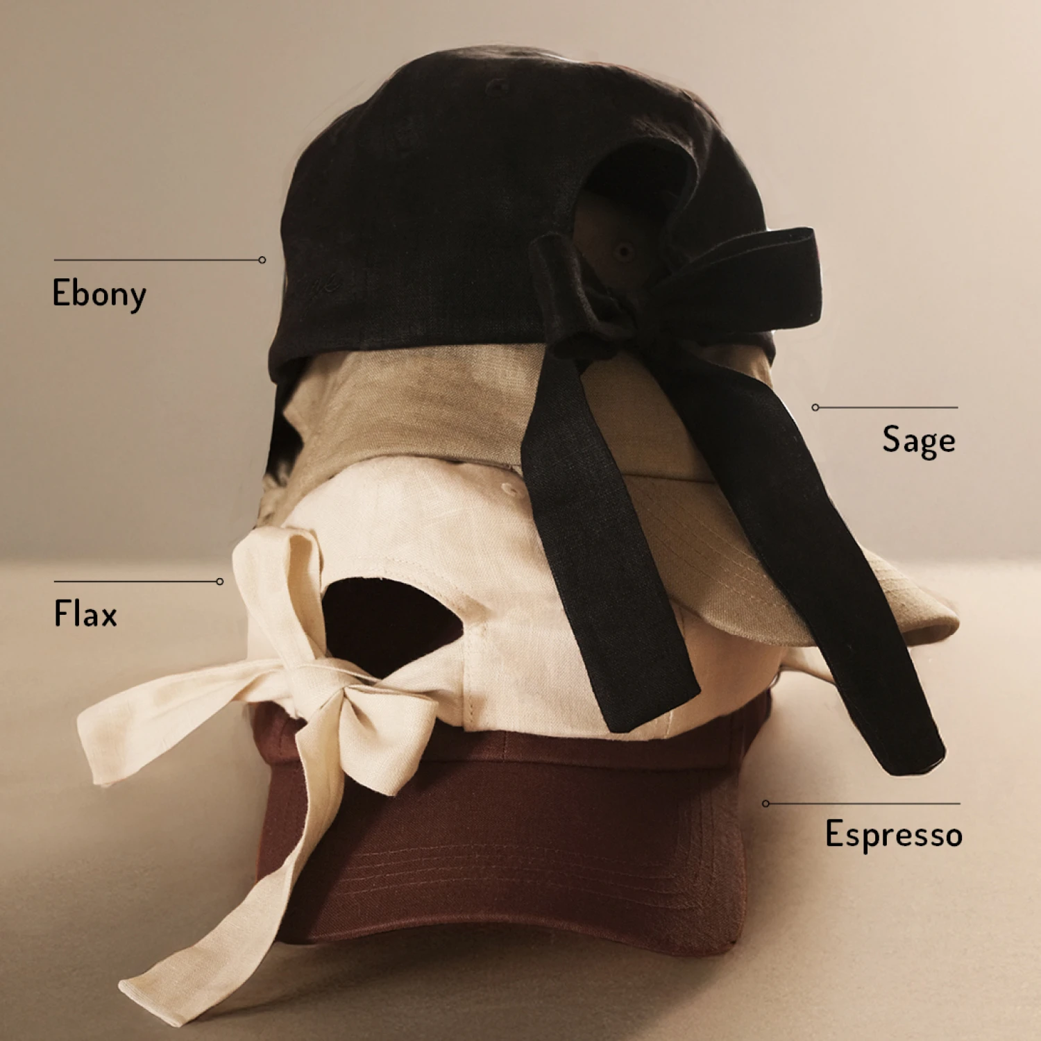 With their adjustable bow, silk-lined comfort and timeless neutral shades — Ebony, Espresso, Flax and Sage — these caps pair beautifully with linen, denim, dresses and all the easy summer outfits we love.