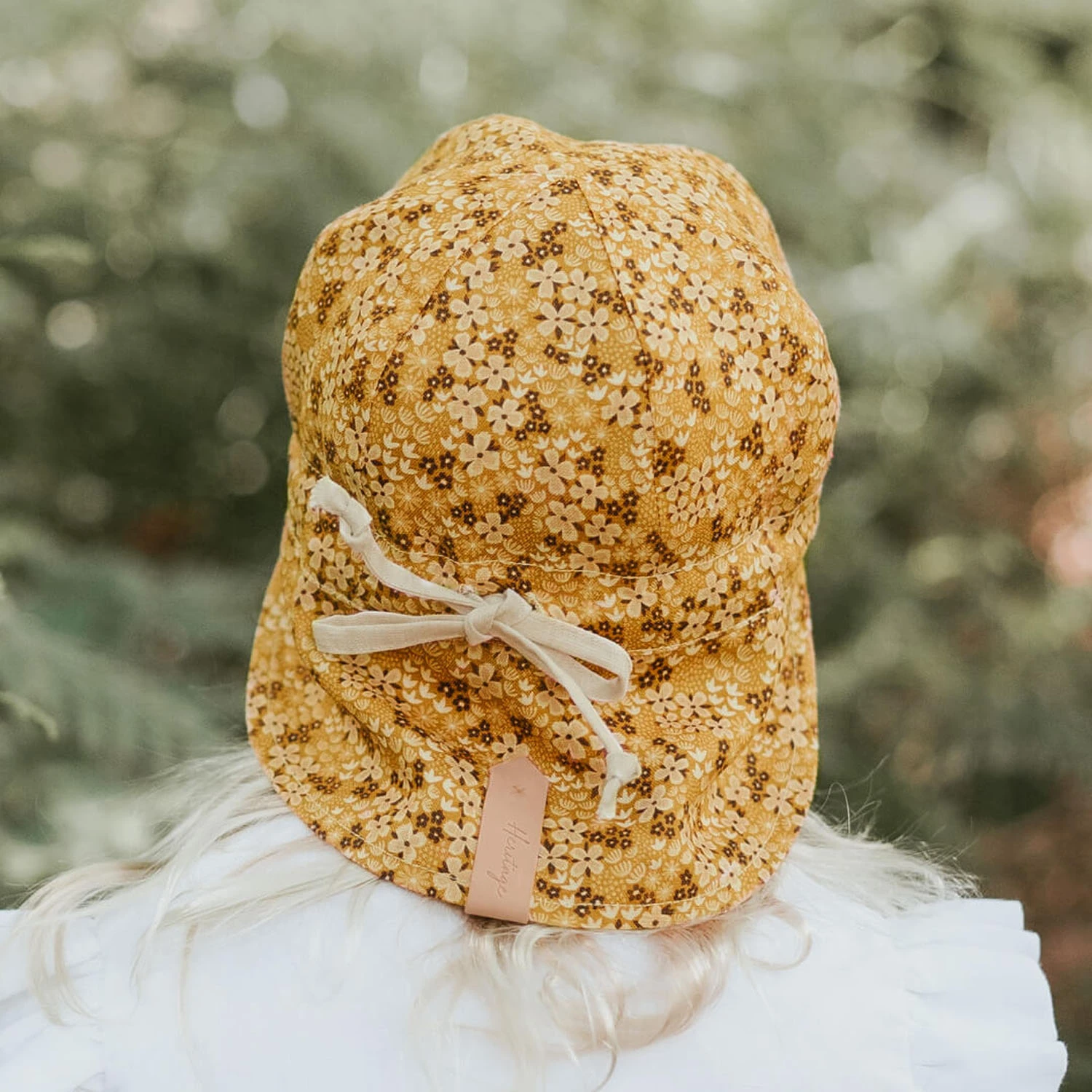 It’s impossible to have a bad day in Farah! So sunny and cheery with its tiny golden blooms and dark purple flowers. The reverse of simple Flax keeps things light and airy. Available in Ruffled Bonnet, Flap Hat, Wide-Brimmed Bonnet, Panelled Bucket and Ladies Sun Hat.