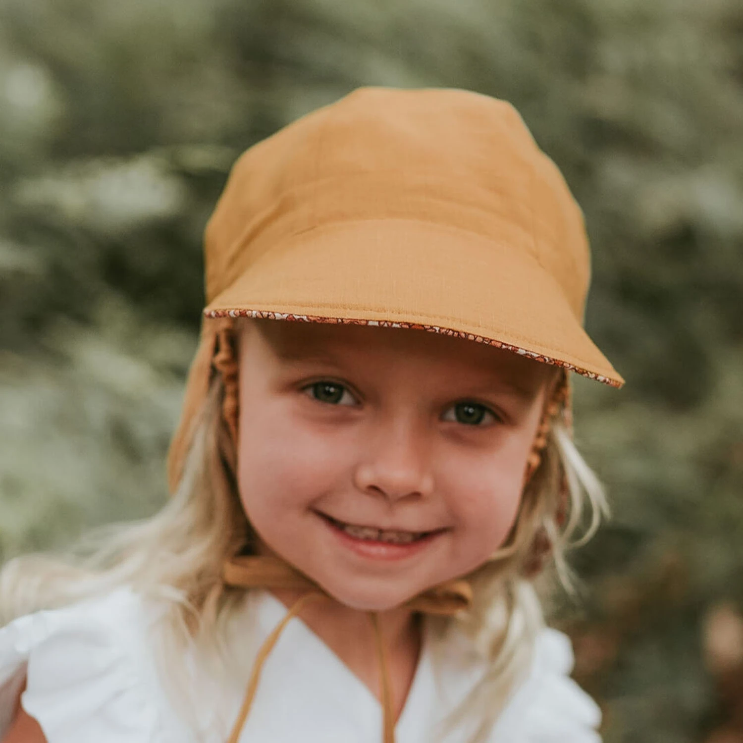 Bedhead Heritage Lounger Baby Flap Hats are light on heads, making them the ideal first hat for babies as they forget they're wearing them! The soft flap lies flat behind baby's neck while they're in a pram or baby carrier, and the brim is slightly upright letting them see the world. Made from 100% eco-friendly linen which can self-cool in summer and warm in winter, the Lounger hat provides UPF50+ sun protection without overheating little heads.