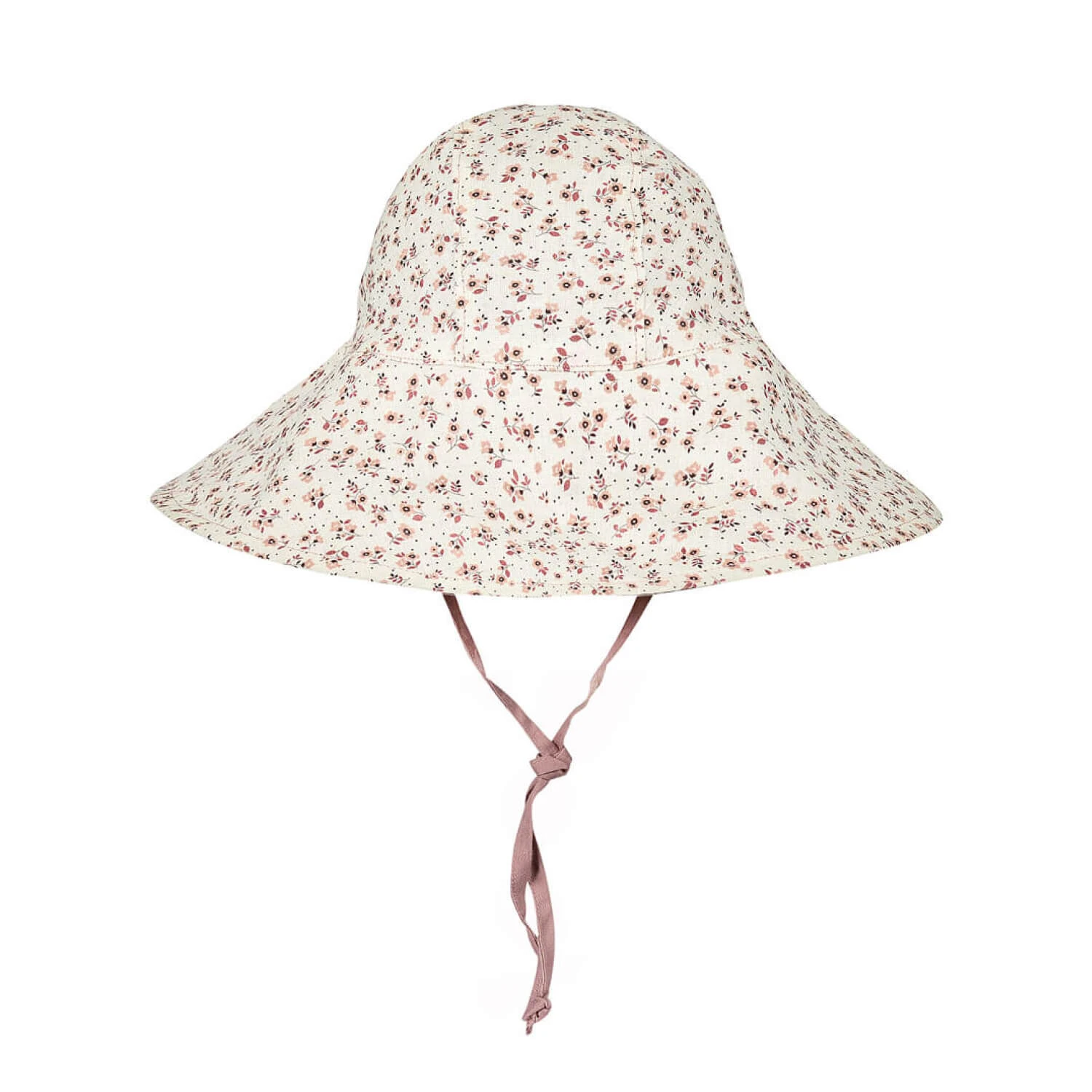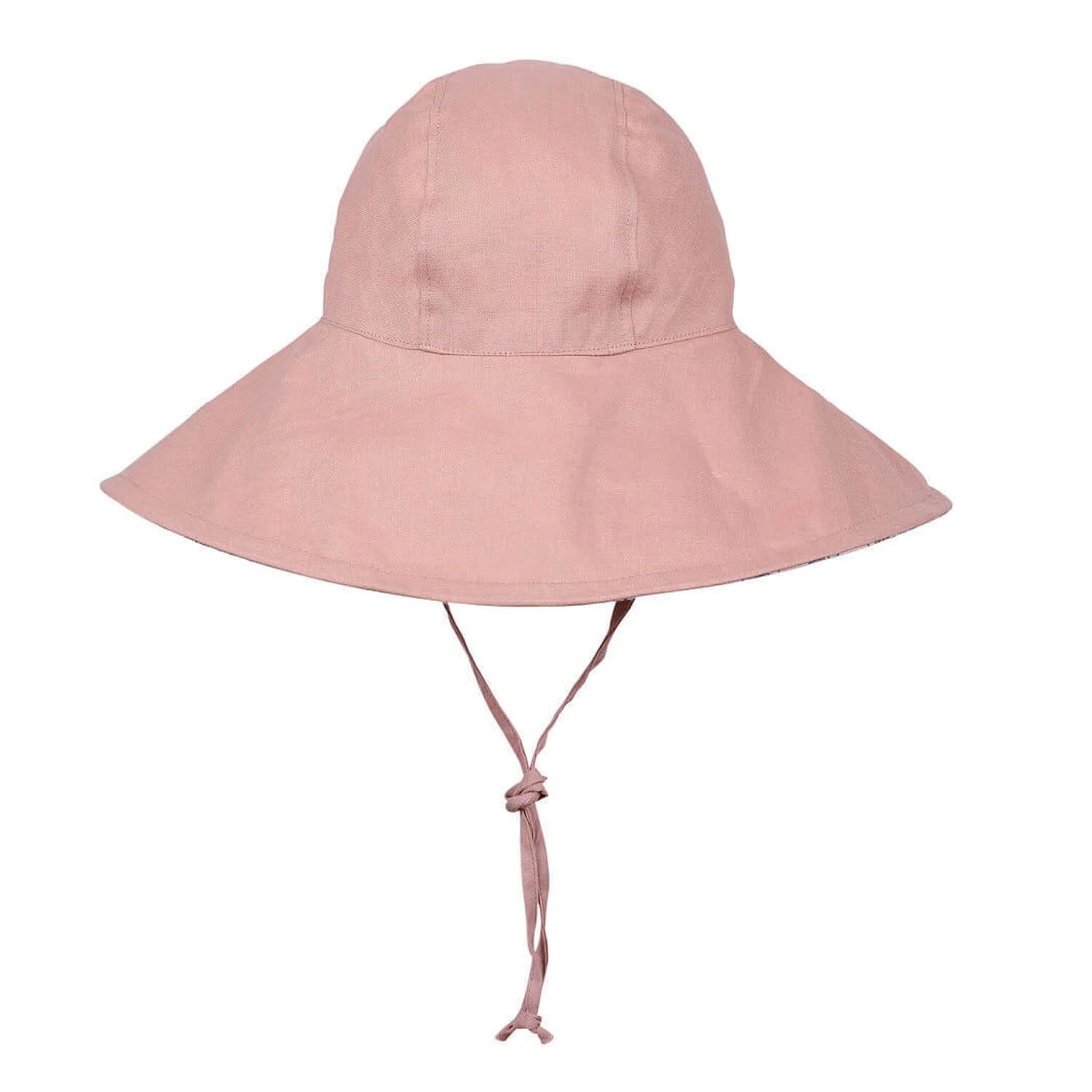 Dainty clusters of pink flowers sprinkled over a natural flax colour with a reverse of the ever-popular Rosa pink! We can just see this with all the flowy dresses and cotton blouses. Available in Ruffle Bonnet, Flap Hat, Panelled Bucket and Wide-Brimmed Bucket.