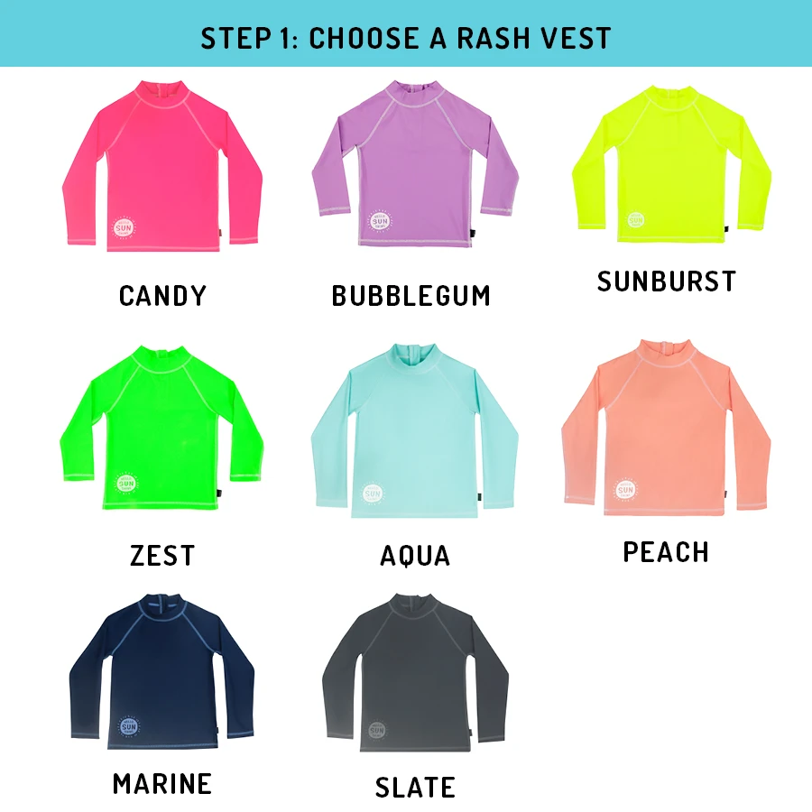 Our childrens rashies are made from a super soft & stretchy chlorine resistant swimwear fabric. Long sleeves and high neck collar provide maximum protection for your little ones.