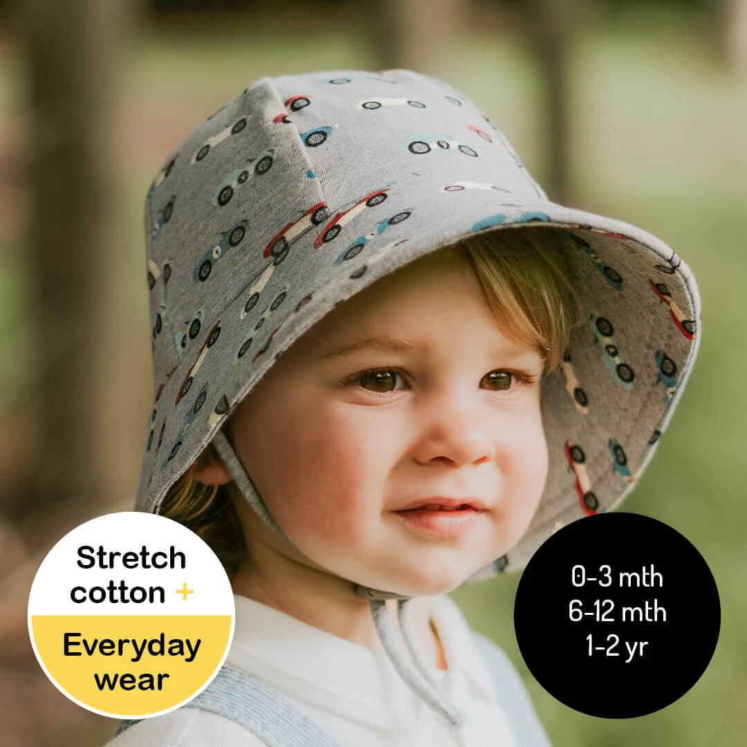 Our Toddler Buckets have a soft flexible brim that introduces babies and toddlers to an angled brim that frames their line of sight. All Bedhead hats are made from our super-stretchy and lightweight cotton jersey and come with a stretchy chin strap (if required, you can easily remove this without compromising the quality of the hat).