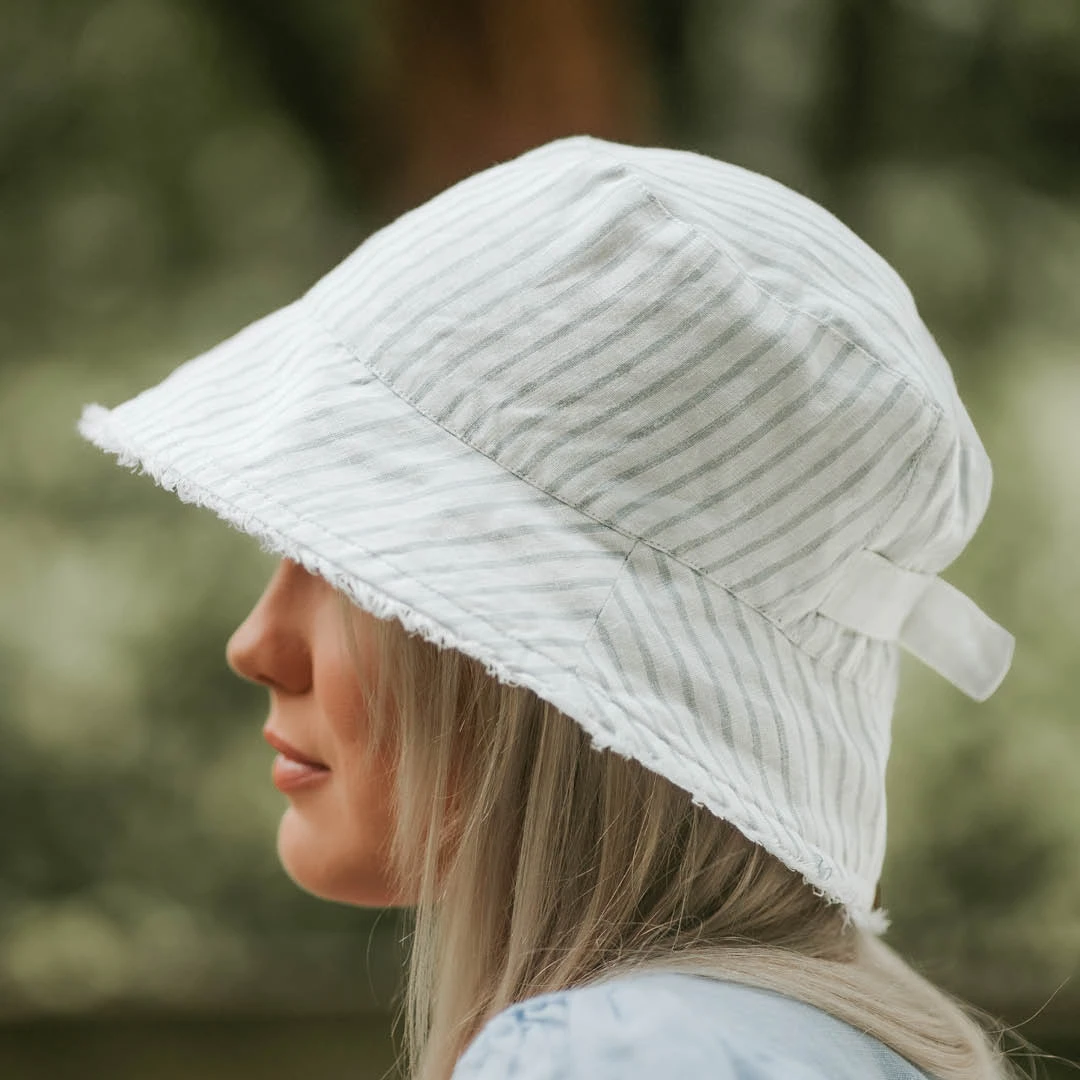 You can’t get more classic than a stripe – and a soft dove grey stripe at that! This go-with-everything colour and pattern suits all genders, all ages and all tastes! We’ve paired it with a pure white to get the best of both neutral worlds in one hat! Finley is available in Sum Bonnet, Flap Hat, Classic Bucket, Ladies Wide-Brim Visor, Adults Frayed Bucket and Ladies Sun Hat.