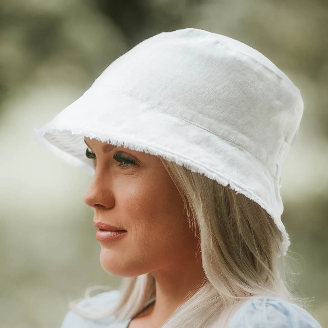 'Traveller' Adults Frayed Bucket Sun Hat - Finley / Blanc