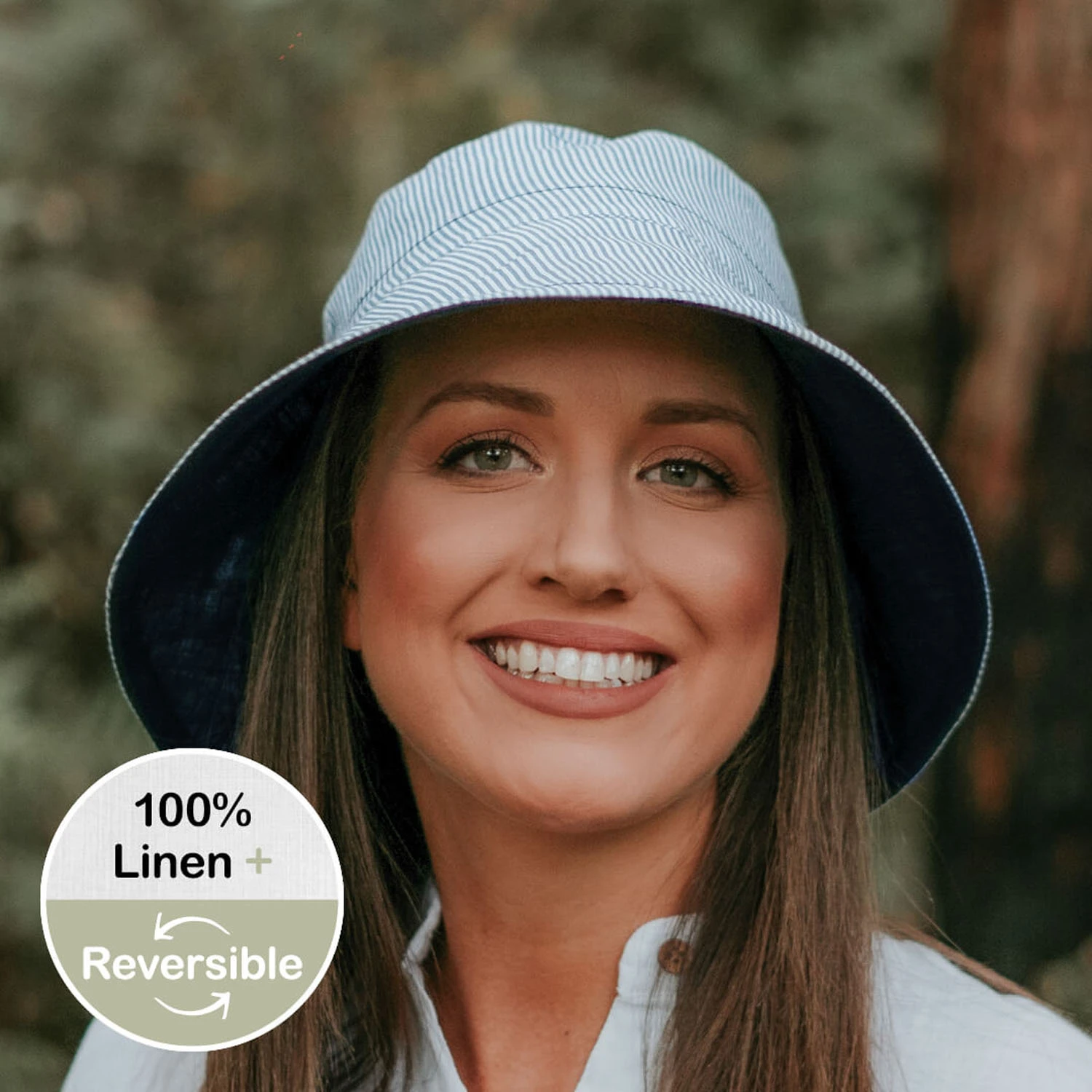 Perfect for all the family! Our Charlie print features inky blue and white stripes with a reverse of Indigo. Available in Sun Bonnet, Flap Hat, Classic Bucket, Ladies Wide Brimmed Visor, Adults Frayed Bucket Hat and Ladies Sun Hat.