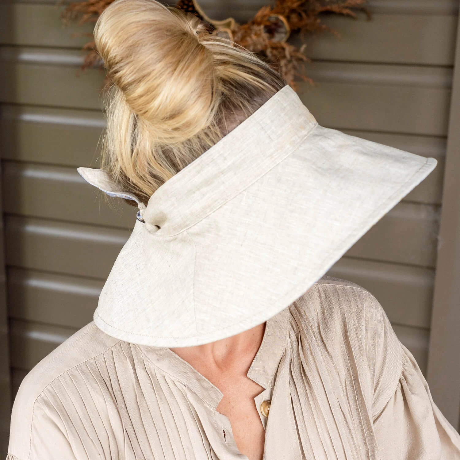 Crafted from 100% eco-linen and rated UPF50+, the Voyager visor offers lightweight protection and adjustable comfort. Pair it with your mini for an effortless matching moment.