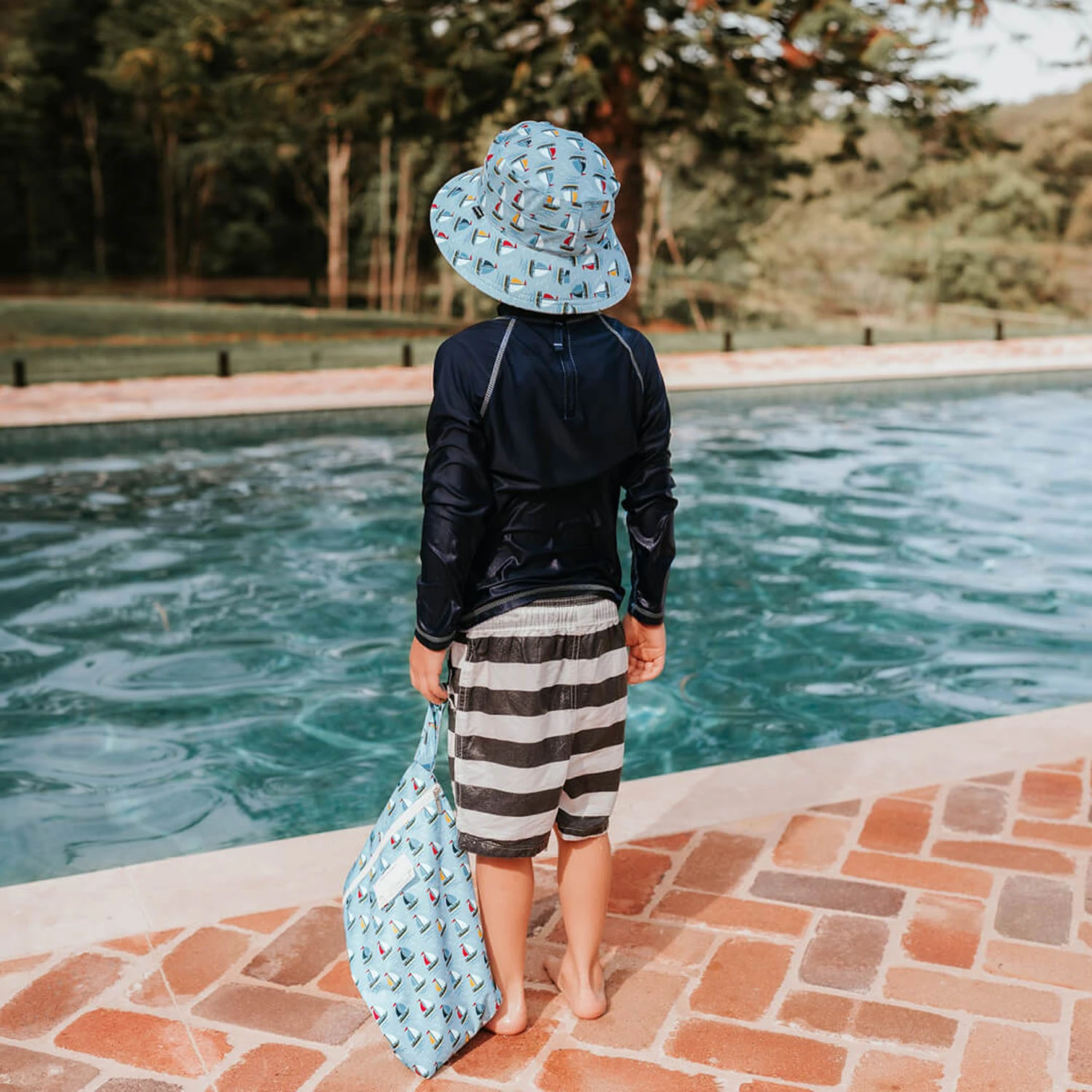 For little lovers of the deep blue sea, these cute sailboards with white, blue, yellow and red sails need a Marine or Slate rash vest to complete the look! Available in Legionnaire, Classic Bucket and Wet Bag.