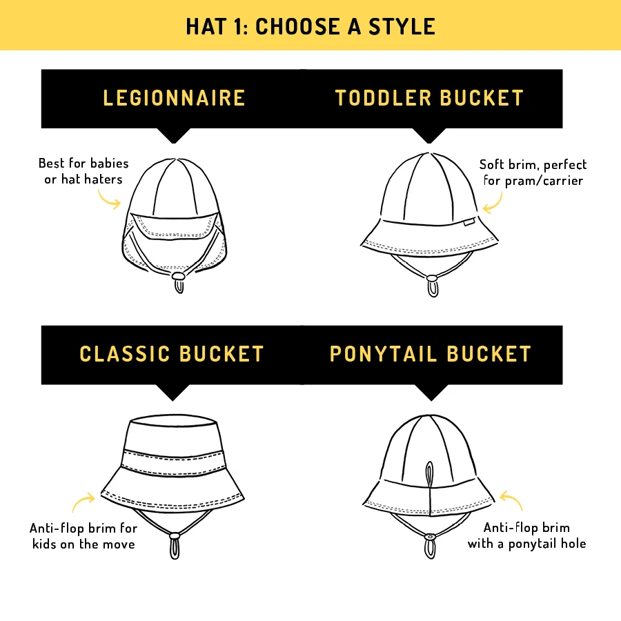 • Toddler bucket hat - Soft, flexible hat that stays on while they play. Perfect for daycare and park trips.