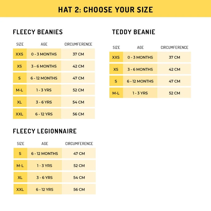3. Purchase the size closest to your child's measurement - our hats stretch up to 4cm.